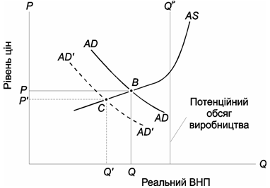 Нехай економіка перебуває у короткостроковій рівновазі у точці В. Далі внаслідок змін у споживчих видатках, видатках держави або фірм крива сукупного попиту перемістилася ліворуч у положення АD'. Якщо немає змін у сукупній пропозиції, то економіка досягає нової рівноваги у точці С. Зауважте, що обсяг виробництва зменшується з Q до Q' і ціни падають (або, що нині реальніше, зменшується темп інфляції).