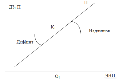Виникає питання, яким чином впливає на економіку фіскальна політика, котра спирається на автоматичну залежність величини податків від рівня ЧНП. Щоб відповісти на це запитання, звернемося до рис 1. На ньому горизонтальна лінія ДЗ відображає незалежність державних закупок від ЧНП, а лінія П – зростання податкових надходжень у міру збільшення ЧНП. Співвідношення цих ліній за різних рівнів ЧНП спричинює неоднаковий стан бюджету. Він може бути збалансованим, дефіцитним або з надлишком.