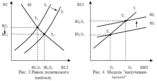 На ринку позичкового капіталу лінія запланованих інвестицій зміщується вправо в положення ВІ2, що викликає зростання ВС до ВС2. Оскільки заощадження знаходяться в прямій залежності від ВС, то їхня величина збільшується до З2 і в точці Т2 заплановані інвестиції врівноважуються із заощадженнями.