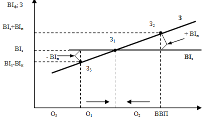 За більш високих рівнів ВВП заощадження, які є функцією ВВП, будуть перевищувати заплановані інвестиції, які є складовим елементом запланованих сукупних витрат. Так, коли ВВП=О2, заощадження більші від запланованих інвестицій (З2більше ВІз), але врівноважується із фактичними інвестиціями за рахунок незапланованого збільшення інвестицій в товарні запаси (З2=ВІз+ВІн). За більш низьких рівнів ВВП заощадження, як функція ВВП, будуть меншими, ніж заплановані інвестиції. Так, коли ВВП дорівнює О3, заощадження менші від запланованих інвестицій (З3 менше ВІз), але врівноважуються із фактичними інвестиціями за рахунок незапланованого зменшення інвестицій в товарні запаси (Зз=ВІз-ВІн).