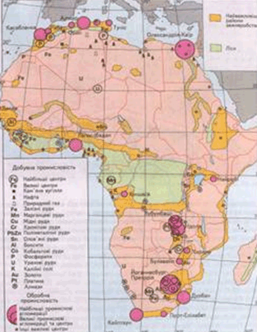 Гірничодобувна та гірничо-металургійна промисловість - найрозвинутіші галузі промисловості Африки. У виробництві міді значне місце посідають Замбія і Заїр, де рудники зосереджені в *мідному поясі". Крім міді, в цьому поясі добувають руди інших металів, збагачують і виробляють цинк, свинець, кобальт, золото, срібло, уран. У цілому гірничодобувна промисловість розвинута в 1/4 частиш молодих країн континенту, але основна частина продукції та видобутку найважливіших видів гірничорудної сировини припадає на три країни - ПАР, Замбію, Заїр.
