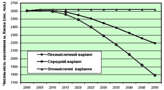 Збереження чисельності населення столиці на нинішньому рівні до 2050 р. можливе лише в тому разі, якщо середня тривалість життя чоловіків зросте до 74,3 року, жінок - до 80,5 року; сумарний показник народжуваності - до 1,4 дитини; буде прийнято й облаштовано за прогнозний період 886 тис. прибулих, тобто в середньому близько 18 тис. чол. щорічно (середньорічний міграційний приріст у 90-ті роки минулого сторіччя становив близько 5 тис. чол.).