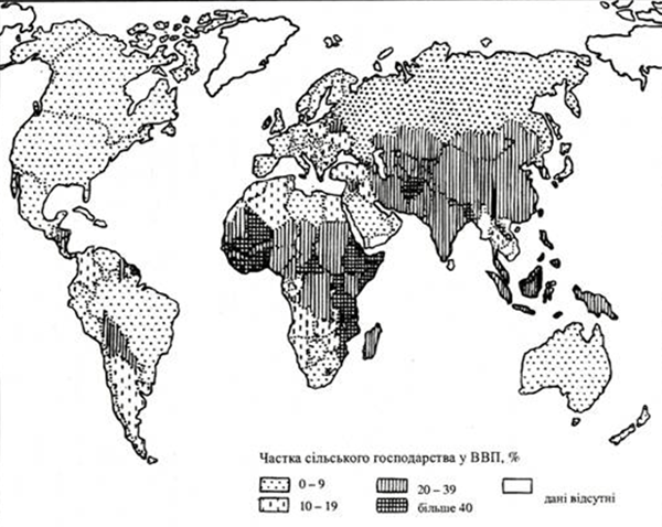 Рис. 1. Частка сільського господарства у ВВП країн світу.