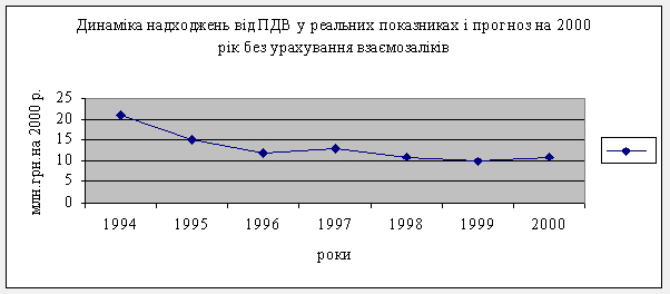Прогноз-2000, суперечить існуючій тенденції, передбачаючи певне зростання обсягу ПДВ у реальному визначенні порівняно з рівнем 1998 р. Обсяг надходжень ПДВ, запланований на 2000 р., перевищує очікуване виконання бюджету в 1999 р. на 10.2 відсотка в реальному визначенні.