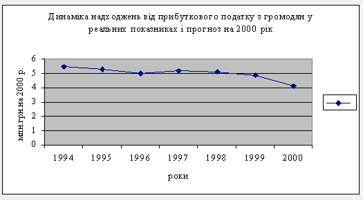 На наведеному вище графіку показано динаміку збирання реальних надходжень від податку на прибуток підприємств, починаючи з 1994 р., а також прогноз надходжень у бюджеті на 2000 р. Як видно з графіка, від 1994 р. надходження з цього джерела постійно скорочувалися. На протязі 1994-96 рр. скорочення було різким, але починаючи з 1997 р. уповільнилося.