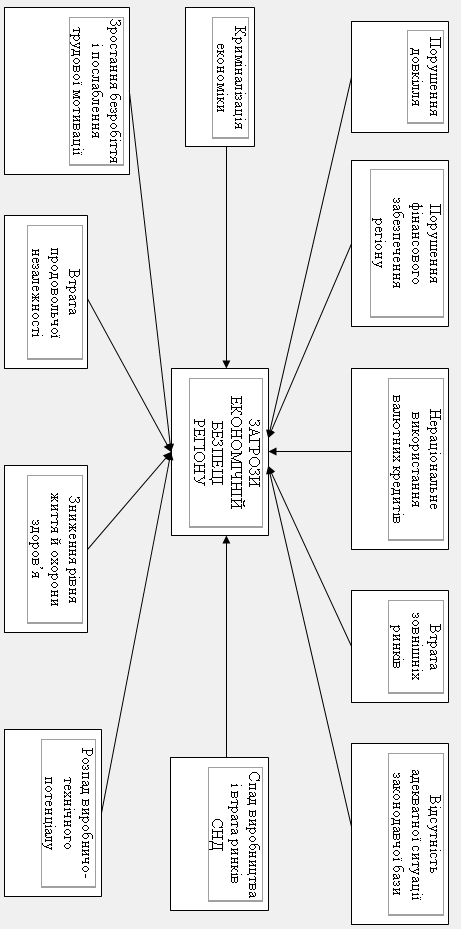 На наш погляд, до числа найважливіших загроз ЕБ слід, зокрема, віднести рівні технічного, соціального й виробничого відставання, а також порушення екологічної, демографічної і правової структур, втрату продовольчої незалежності (мал. 1). Роблячи такий висновок, ми брали до уваги той факт, що окреме територіальне утворення (регіон), з огляду на інтереси ЕБ України, залишається при цьому стійкою і прогресуючою територією, яка спроможна ефективно нейтралізувати економічні загрози або запобігти їм.