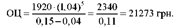 Припустимо, підприємство у попередній рік виплатило дивідендів на суму 1920 грн, а темпи збільшення валового національного продукту становлять 4%. На основі цих даних спрогнозуємо суму дивідендів і ціну акції наприкінці п’ятирічного періоду: