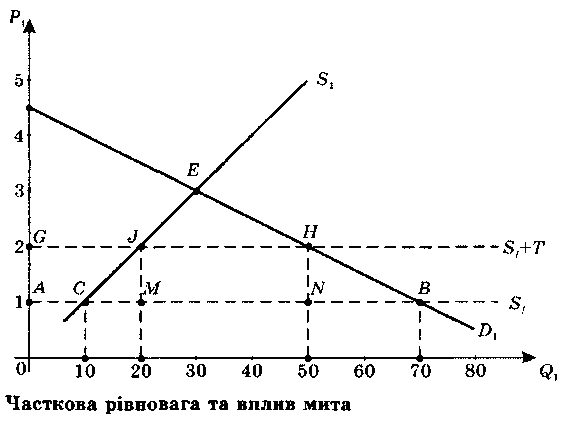 Вплив мита на часткову рівновагу відображено на рис. 2.20, де D1 — це крива попиту, а S1 — крива пропозиції товару 1 в країні Б. У разі відсутності торгівлі перетин кривих D1, та S1 визначає точку рівноваги Е, коли попит становить 30 од. за ціною P1 = 3 грн. За умов вільної торгівлі світова ціна становитиме P1 = 1 грн, а країна Б буде споживати 70 од. товару 1 (АВ), з яких 10 од. (АС) виробляється у країні, а решта 60 (СВ) імпортується. Пунктирна лінія Sf відображає первинно абсолютно еластичну криву світової пропозиції товару 1.