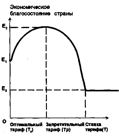 При відсутності тарифу (Т=0) економічний добробут великої країни знаходиться на рівні Е1. Максимальний позитивний вплив тарифу на економічний добробут досягається при оптимальному рівні тарифу Т0, при якому за рахунок перевищення виграшу від поліпшення умов торгівлі над утратами від уведення тарифу економічний добробут зростає до рівня Е2.