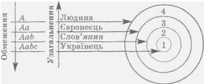 Операції обмеження й узагальнення можна передати з допомогою схеми (схема 1, буквами а, Ь, с позначено ознаки, які віднімаються при узагальненні і додаються при обмеженні поняття).