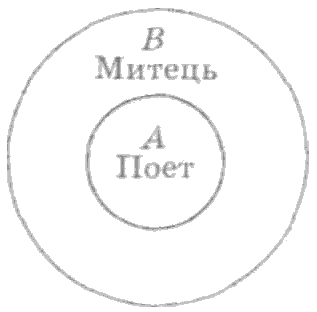 У такому відношенні перебувають поняття "поет" і "митець", "нейтрон" і "елементарна частка", "адвокат" і "юрист".