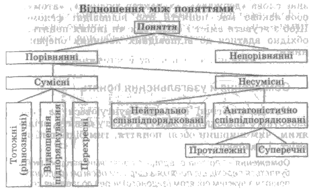 У процесі пізнання виникає потреба зіставляти поняття за змістом і обсягом. Порівнюючи поняття за змістом, можна дійти висновку, що одні з них мають спільні ознаки, а інші не мають. Перші називають порівнянними ("жито" і "ячмінь", "людина" і "вчитель", "істина" і "хиба"), а другі - непорівнянними ("електрон" і "кохання", "мораль" і "хімічний елемент", "рослина" і "політика").