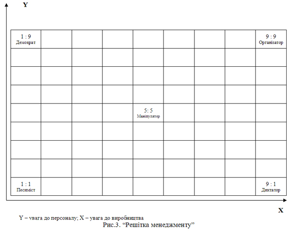 Ця "решітка" дає можливість визначити п'ять основних характерних типів управлінської поведінки (всього 81 - 9х9):