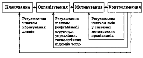 Регулювання як загальна функція менеджменту. Залежно від характеру перешкод чи недоліків, виявлених у процесі контролю в керованій системі, регулювання може скеровуватись на конкретний блок (планування, організування чи мотивування). Якщо проблеми виникли у блоці «Планування», розроблені заходи стосуватимуться вдосконалення економічного, соціального чи технологічного планування; виникнення їх в організаційній структурі зумовить необхідність реалізації заходів у блоці «Організування» щодо структури управління організацією, комунікаційних систем тощо; недоліки щодо матеріального стимулювання працівників керованої системи потрібно буде усувати в блоці «Мотивування», вдосконалюючи систему преміювання, дивідендної політики тощо.