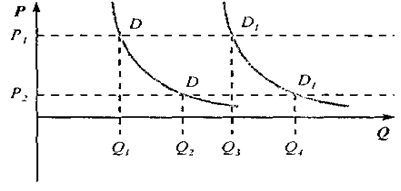 Вплив на попит, окрім ціни, інших факторів викликає зрушення лінії попиту від DD до D1D1 таким чином, що при збереженні ціни на рівні РІ відбувається збільшення попиту з величини Q1 до Q3, а при зниженні ціни до рівня Р2 попит зростає з Q2 до Q4. Зміщується положення попиту, що і називається зміною попиту.