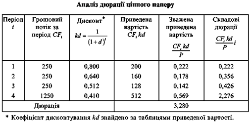 Отже, у термінах приведеної вартості період окупності облігації становитиме 3,28 року, що і є середньозваженим строком погашення — дюрацією, а тому підприємству доцільно вибрати саме цей напрям вкладення коштів.