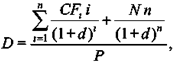 де CFt — очікувані потоки відсоткових доходів в г'-й період (г = 1,... ..., п); і— періоди проведення виплат; η— загальна кількість періодів; d— ставка дисконтування; N— номінальна сума боргу (або ціна продажу); Ρ — дисконтована ціна цінного паперу.