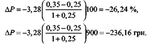 Проаналізуємо зміну вартості облігації, яка нині продається за ціною 900 грн, якщо дюрація дорівнює 3,28 року, а прогноз свідчить про підвищення відсоткових ставок на ринку упродовж поточного року з 25 % до 35 %.