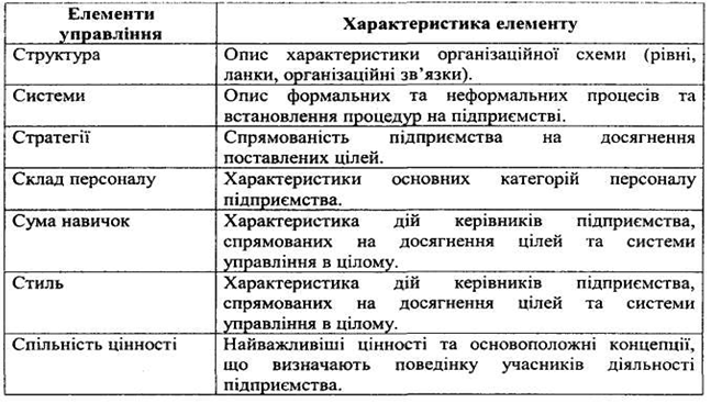 Основними елементами управління підприємством є стратегії, структура, системи, стиль, сумісність цінності, склад персоналу, сума навичок. Характеристика елементів управління наведена в таблиці 1.