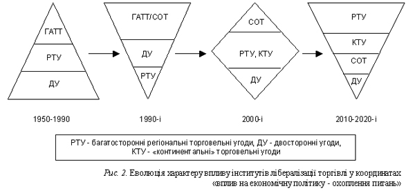 Схема 2. Еволюція характеру впливу інститутів лібералізації торгівлі в координатах "вплив на економічну політику – охоплення питань"