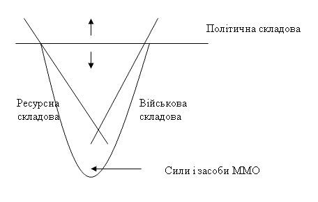 На схемі кожна сторона трикутника позначає одну складову. Ресурсна і військова складові – це сили і засоби ММО. Чим довші відповідні сторони трикутника, тим більша кількість сил і засобів застосовується в операції. Політична складова (сторона трикутника) може переміщуватися в трикутнику, задаючи в такий спосіб більшу чи меншу кількість сил і засобів, задіяних для проведення ММО.