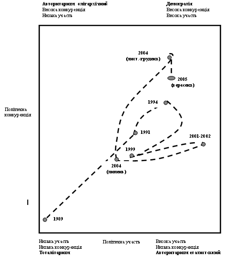 Трансформаційні процеси, що відбуваються в Україні, не слід розглядати в лінійній площині. На мою думку, тут коректніше було б говорити, принаймні, про два різновекторні процеси. Перший пов’язаний зі змінами політичних інститутів в напрямі демократизації. Другий – з рухом у зворотному напрямі: збереження і розвиток інститутів авторитарного режиму. З цієї точки зору, еволюцію політичного режиму в Україні в 1991 – 2004 роках слід розглядати крізь призму процесів демократизації та олігархізації. Схематично це матиме вигляд зигзагоподібних коливань між умовними полюсами "демократія" та "авторитаризм" (див. схему).