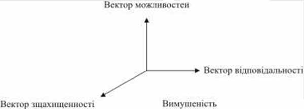 Графічно цей простір можна зобразити у вигляді тримірної моделі, де осями координат виступають вектори: соціальні можливості; психологічна відповідальність; соціально-психологічна захищеність. Умовний нуль являє собою згорнутий вектор соціально-психологічної вимушеності у поведінці та життєдіяльності особистості (див. малюнок 1).
