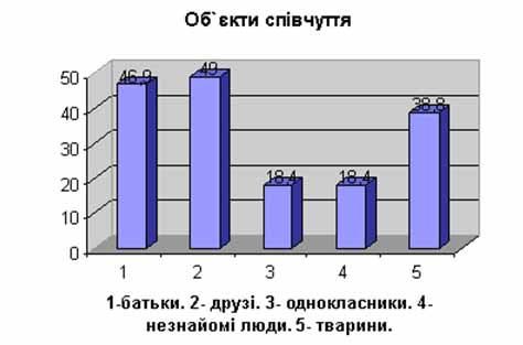 Результати засвідчили, що діти найчастіше співчувають друзям (49% опитаних) та батькам (46,9%). Тваринам співчувають 32,7% учнів. Далі йдуть товариші, однокласники – їм співчувають 18,4% ліцеїстів. І тільки 12,2% дітей співчувають незнайомим людям. Результати ілюструє діаграма 2.