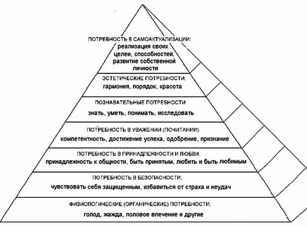 У самої основи піраміди розташувалася група найнеобхідніших фізіологічних потреб; потім шар потреб, що забезпечують соціальні і страхові гарантії; далі йдуть соціальні потреби (приналежність до спільноти, підтримка, визнання); далі – потреби в самоствердженні, статусі і репутації; на самій вершині – потреби в самовираженні і самореалізації.