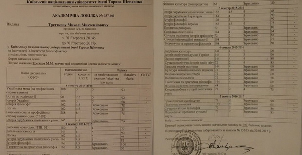 Академдовідка про навчання Миколи Третякова - студента КНУ (Як бачимо, раніше у студента проблем з навчанням не було)