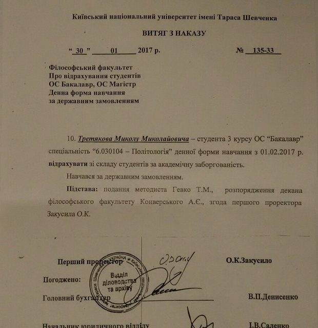 Витяг з наказу про відрахування Миколи Третякова - студента КНУ